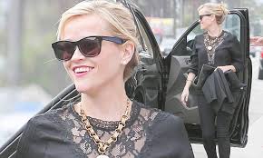 She never fails to turn heads with her show-stopping red carpet ensembles and retro-inspired wardrobe.But Reese Witherspoon ditched her usual girlie glamour headed out on a lunch date with friends in Santa Monica on Tuesday afternoon. The 38-year-old actress unleashed her inner vampy vixen as she flashed her white bra in a daring black top, which featured a daring plunging sheer lace panel down the front. Taking the plunge: Reese Witherspoon ditched her usual girlie glamour as she headed out on a lunch date with friends in Santa Monica on Tuesday, flashing her white bra in a plunging semi-sheer black topAppearing happy and relaxed as she headed inside the restaurant, the Wild star teamed her racy garment with a pair of skintight Goldsign black jeans that highlighted her petite frame to perfection. In keeping with the rest of her sophisticated ensemble, the mother-of-three with a pair of black leather heeled shoe boots and a matching clutch, while draping a tailored jacket over one arm in case of a change in the weather.