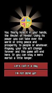 Steam Community :: >The requested URL /viewtopic.php?f=48&t=34213 was not found on this server. Allows the Hero/ine to ascend to the surface Draws newly-spawned enemies to the Hero/ine Daytime enemy spawn rate matches nighttime enemy spawn rate Atop a pedestal, at depth 26 The Amulet of Yendor is the dungeon's ultimate prize, and the Hero/ine's sole/main reason for entering the dungeon. The Amulet of Yendor is the most powerful known artifact of unknown origin. It is said that the amulet is able to fulfil[sic] any wish if its owner's will-power is strong enough to "persuade" it to do it. It can only be dropped, or thrown, and cannot be equipped; it still has no activated ability at this time. Having the Amulet of Yendor in the backpack allows the Hero/ine to ascend to the surface & leave the Dungeon. However, newly-spawned enemies will be drawn to the Hero/ine, as if a Seed of Rotberry/Alarm trap/Scroll of Challenge had been activated. And, once the Amulet is obtained, it will make daytime enemy spawn rate, match nighttime enemy spawn rate (& throwing it won’t change anything).