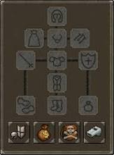 All players wield weapons (other than ) in their right hand. If a player is using a two-handed weapon, such as a bow or a , they may not have any items equipped in the offhand slot at the same time. In the case of thrown weapons, which are stackable, multiples of the same thrown weapon may be equipped in the mainhand slot at once. A player may also equip a , a woodcutting or a in the mainhand slot so that they may hold more ore, logs or fish, respectively. It is possible to sheathe items normally held in the mainhand slot, either by right clicking on the abilities action bar and selecting toggle-sheathe, or by pressing the numpad * while the action bar is displayed. The item will appear to be carried on the player's back or hip. For combat purposes, some type of is usually equipped in this slot. However, there are also many non-combat items that a player may equip here, ranging from aprons to rewards from random events. The torso slot often provide the best bonus of a set. In many cases with armour, the platebody and matching chainbody will have the same life point bonus but the platebody will always have a better armour rating.