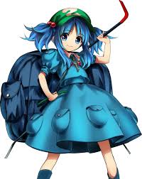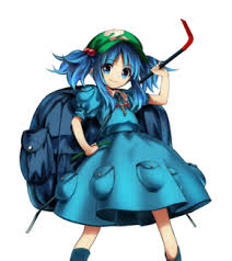 Nitori Kawashiro is a very shy Kappa who lives on the Youkai Mountain. In fact, the first time she saw the heroine in Mountain of Faith, she ran off with barely a word. She's good-natured though, but had an odd way of showing it when she tried to scare the heroine away from the mountain via danmaku and spell cards. It was for the heroine's own good, though, as the mountain is a very dangerous place for humans, and Nitori just didn't want her to get hurt. She actually likes humans; she just doesn't seem to know how to act around them. During the events of Subterranean Animism, she is one of the Kappas who hears from the Goddess of the sky about Utsuho's new power of nuclear fusion in the Underworld. However, they are not willing to go there due to the Oni living underground. Learning that Reimu was going underground to investigate, she convinced Marisa to explore there as well, since she didn't seem to have anything better to do. Ad blocker interference detected! Wikia is a free-to-use site that makes money from advertising.