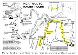 Peru Treks & Adventure Home / About Us / Inca Trail Prices & Services / Inca Trail Map / Frequently Asked Questions / Inca Trail Itinerary / Inca Trail Photos / Porter Welfare / Responsible Tourism / Community Projects / Recommended Hotels / Contact Us Inca Trail 4 day Itinerary Inca Trail 4 day Trek to Machu Picchu - Trek Itinerary Day 01: Cusco to Wayllabamba (12km) The first day of the trek is relatively easy and serves as training for the days to follow. Travellers are collected early from their hotels (5:30 - 6:00am) and travel by bus, past the picturesque villages of Chinchero, Urubamba and Ollantaytambo, for the 2.5 hour scenic trip to kilometre 82 (the start of the trail). Buses normally stop at the town of Urubamba or Ollantaytambo in the Sacred Valley for about an hour to give people the opportunity to have breakfast. The start of the Inca Trail at km82Having arrived at km 82 hikers cross the Vilcanota River and follow the trail to the right as it climbs steeply up from the river.